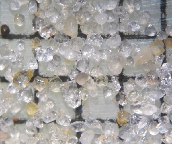 Grains émoussés luisants. Quartz quasi exclusif. Photo prise à l'oculaire d'une loupe binoculaire. Gr. 20x. Quadrillage 1 x 1 mm. |