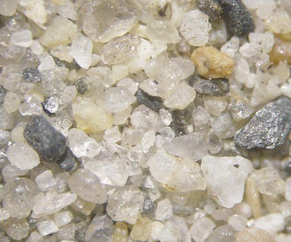 moyens. Ce sable est constitué de quartz, de feldspath et de biotite (mica noir). Les roches environnantes sont majoritairement des micaschistes et des gneiss. Les grains sont anguleux. Photo prise à l'oculaire d'une loupe binoculaire. Gr. 20x. |